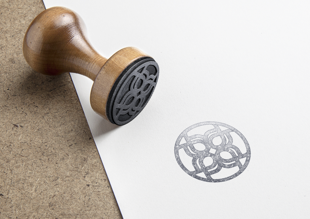Un rosetón, desarrollado a partir de la letra "a", corona el logo de la marca. Dicho símbolo, al ser modular, puede adaptarse formando una trama particular y elegante. Los colores fueron elegidos por las clientas a partir de las lamparas de cobre que adornan su estudio.